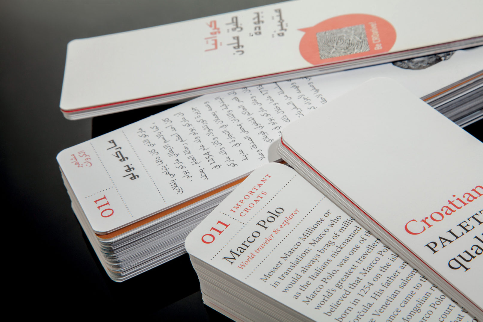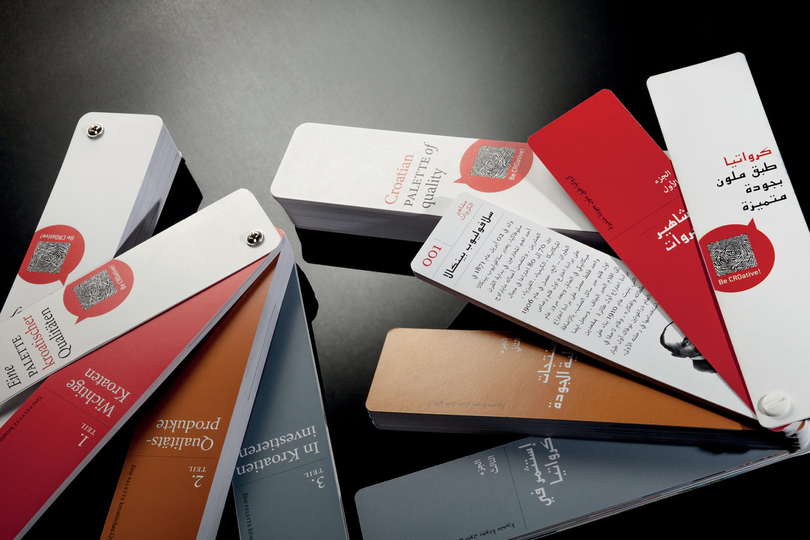 The BeCroative project promotes Croatian products abroad through exhibition events. For this purpose, a visual identity and a bilingual catalog with appendices were designed, based on the principle of the color palette and printed on both sides, so that the reading language changes as the information is turned over in the same order. /// Colaborators: Dejan Brcković, Jelena Filipaj, Davor Komerički, Morana Stinčić, Sanja Žekić, El Zayegh Hamed /// Client: Aquis, Zagreb for Croatian chamber of economy, Zagreb, Croatia.