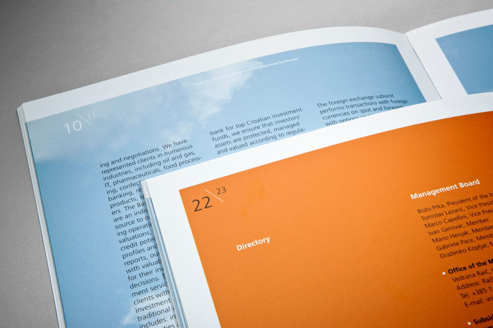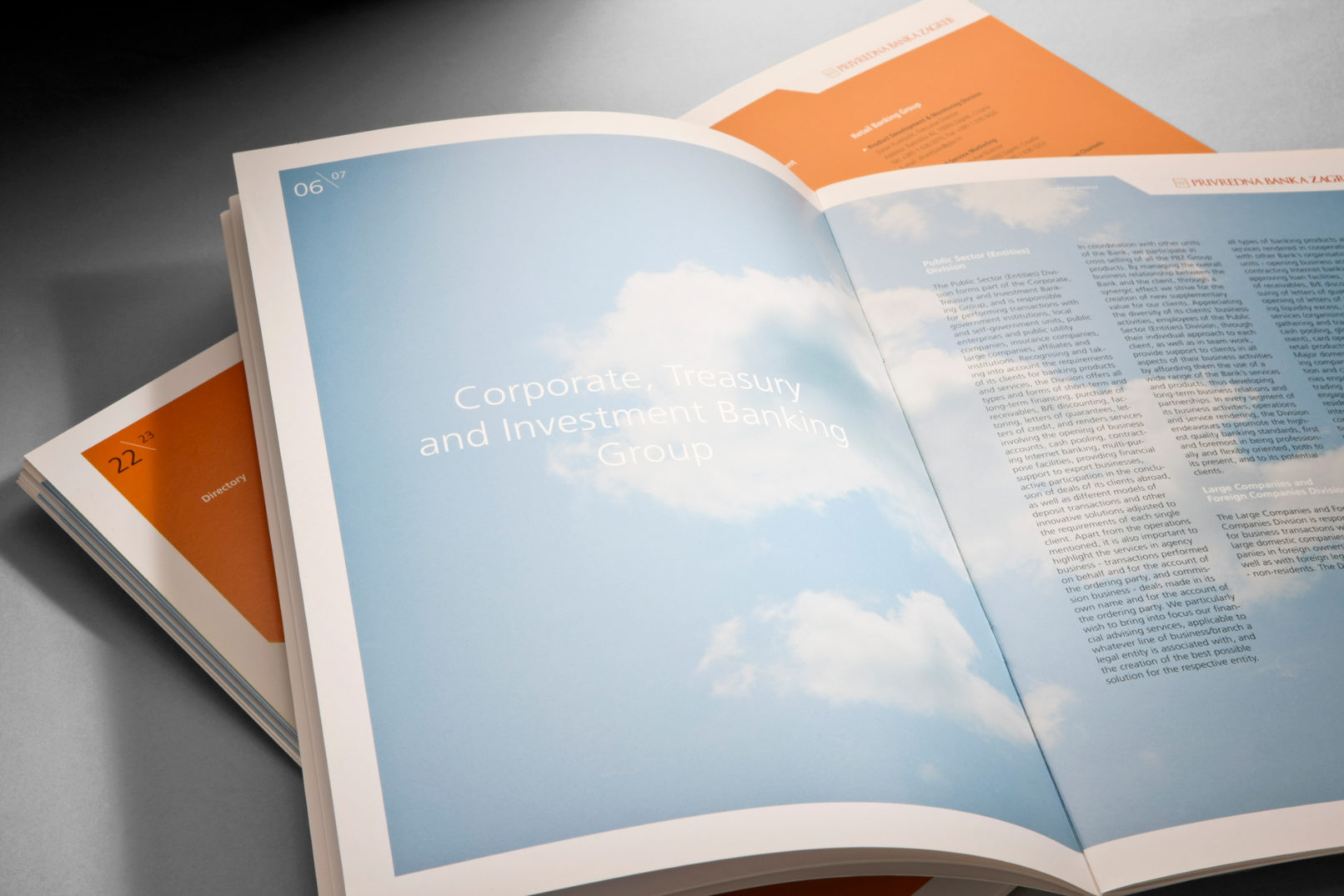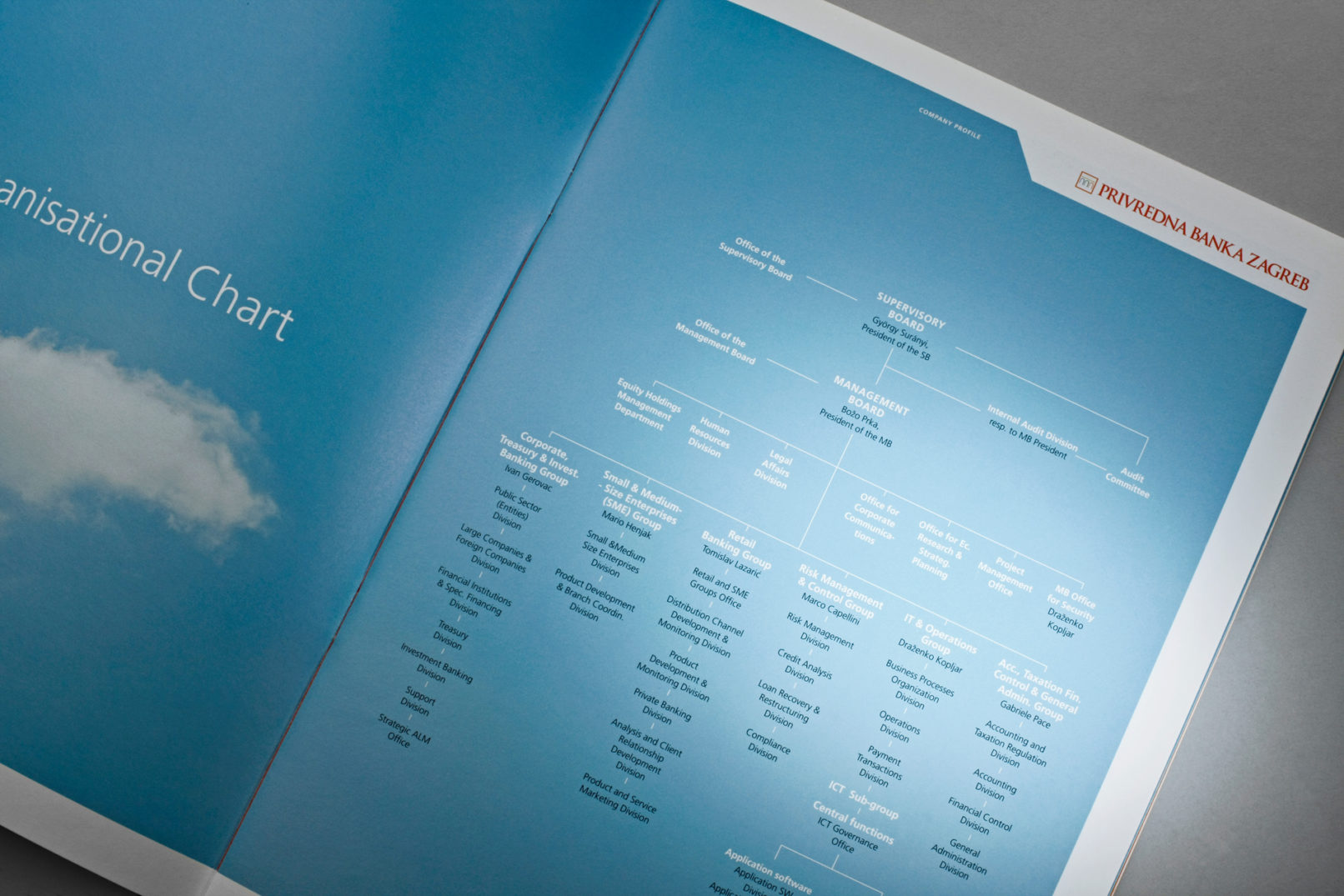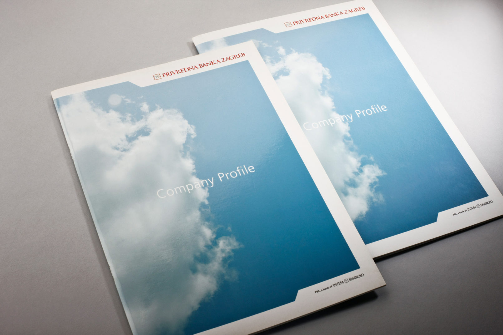 U godini nastanka ovog profila, poslovanje banke je pokazalo izniman rast, što je nametnulo temu oblikovanja – “sky is the limit”. Služeći se fotografijama neba iznad središnjice banke snimljenih tijekom rada na projektu, ta simboličnost je prisutna bez da je igdje spomenuta. /// Fotografija: Marko Koržinek. /// Naručitelj: Unex Euro RSCG Zagreb za Privredna banka Zagreb.