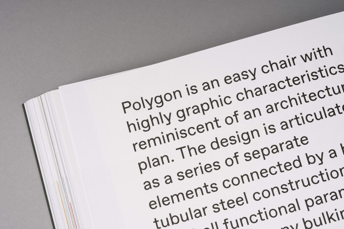 Katalog je namijenjen dizajnerima interijera, arhitektima, projektantima i investitorima kao inspiracija u kreiranju prostora i ističe funkcionalnost namještaja, visoku kvalitetu materijala i modularnost većine rješenja. Odabrano pismo (Favorit) prati tipologiju elemenata namještaja kroz detalje poput kuteva i završetaka poteza slovnih znakova.