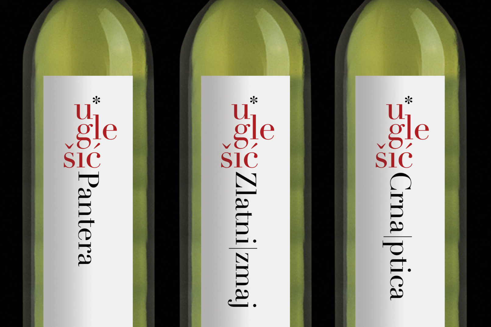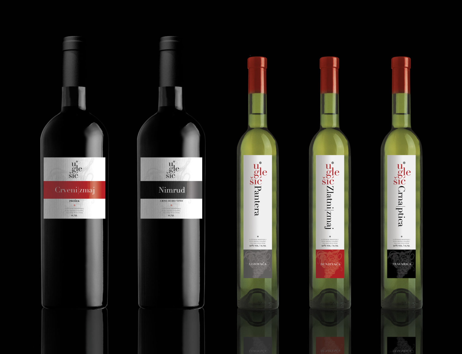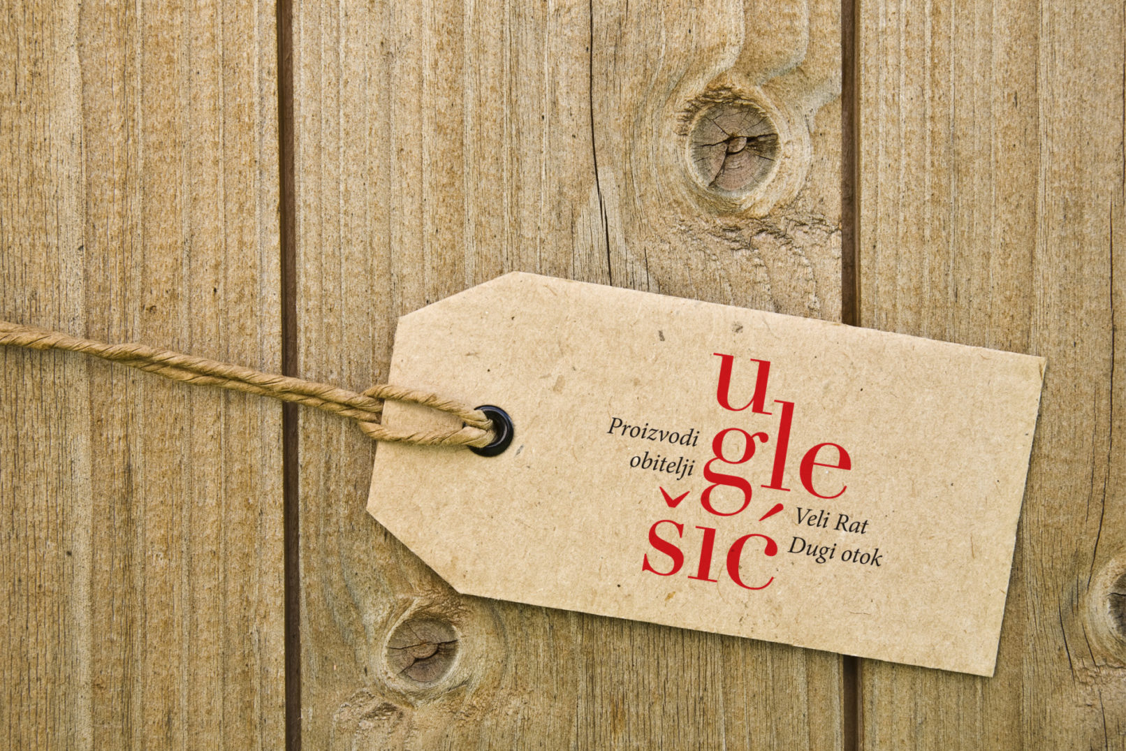 Proizvodi obitelji Uglešić (alkoholna pića), namijenjeni su darivanju. Identitet se zasniva na prepoznatljivom logotipu i seriji etiketa čija je primarna namjena istaknuti ime pojedinog proizvoda, budući da svaki proizvod nosi vrlo karakterističan naziv (nadimci članova obitelji i imena zemljopisnih lokacija). /// Naručitelj: Vlatko Uglešić, Veli Rat, Dugi Otok.